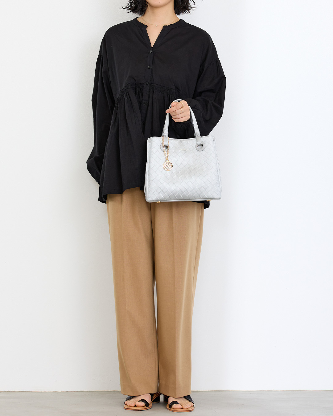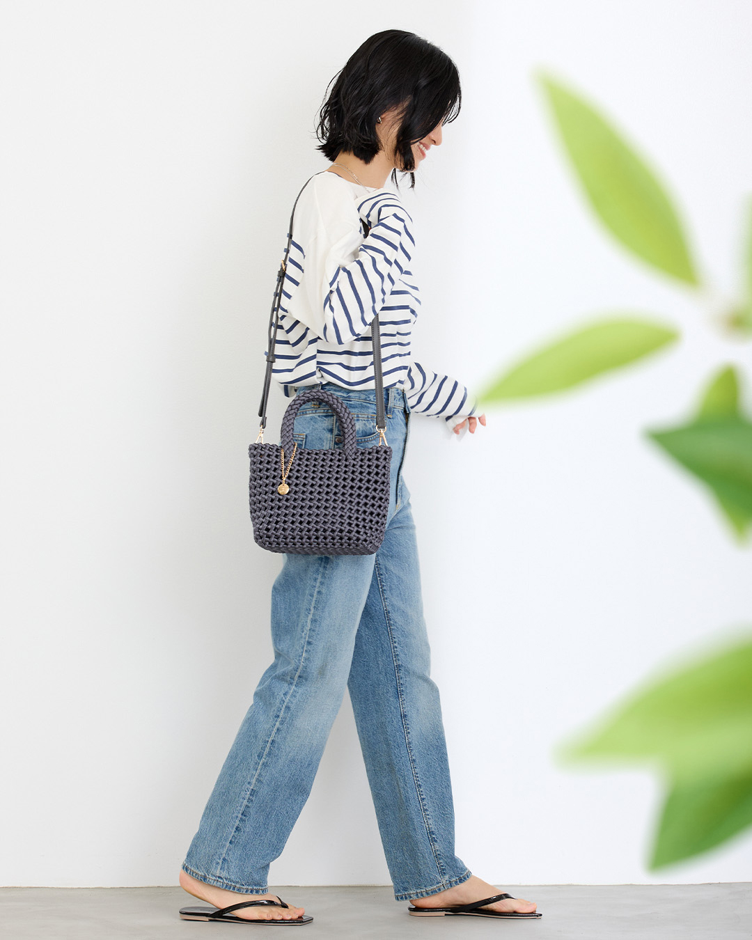涼やかな編み込み素材が上品に映える、程よいサイズ感のハンドバッグ。