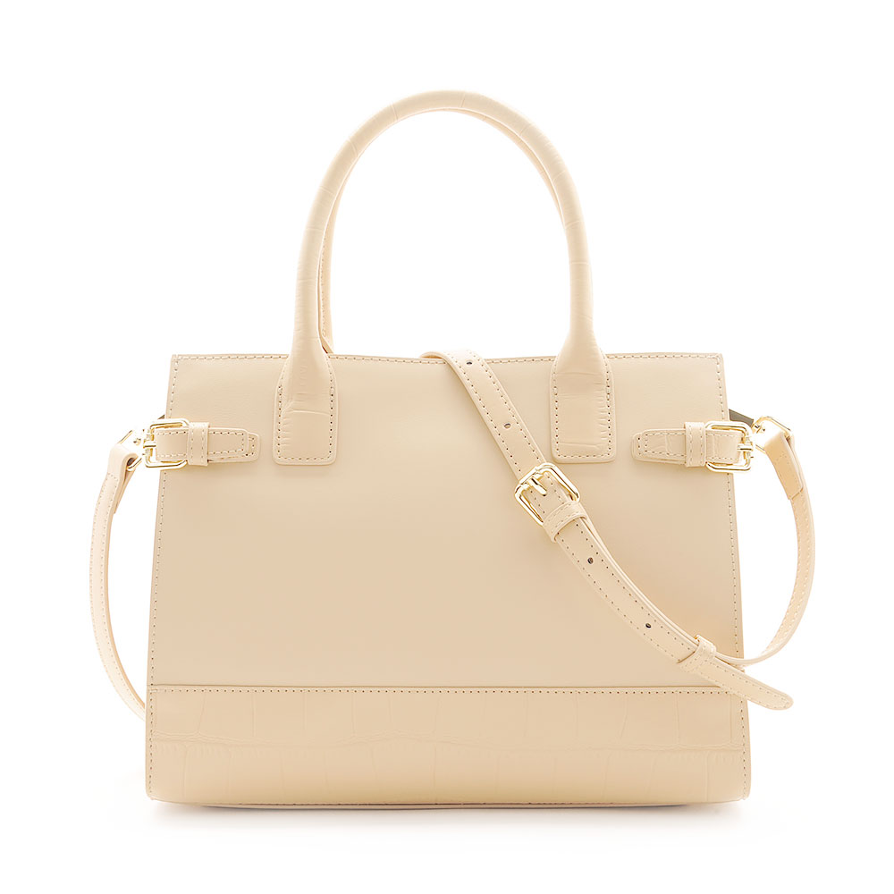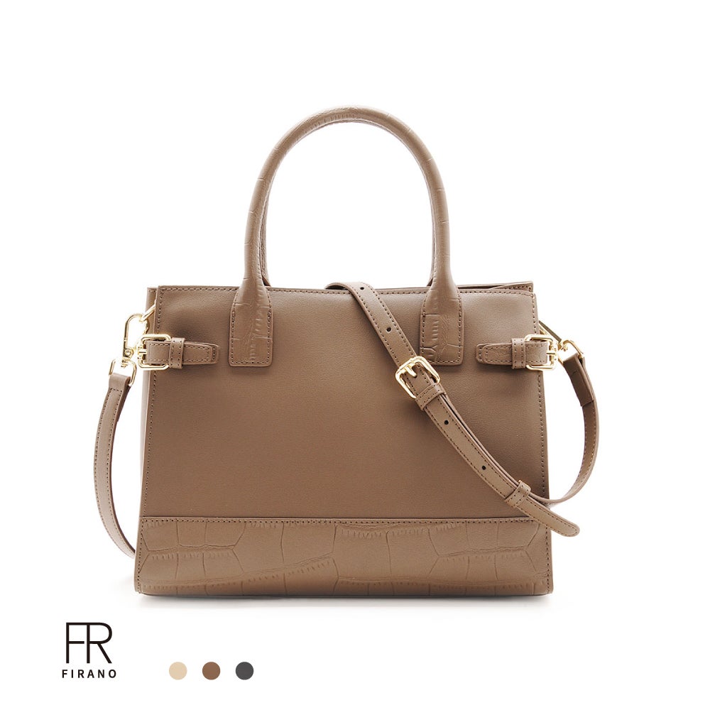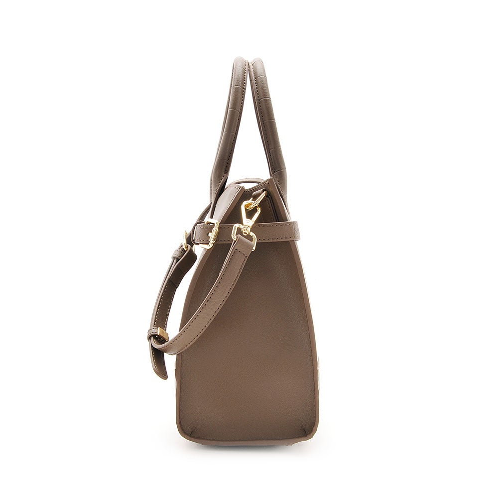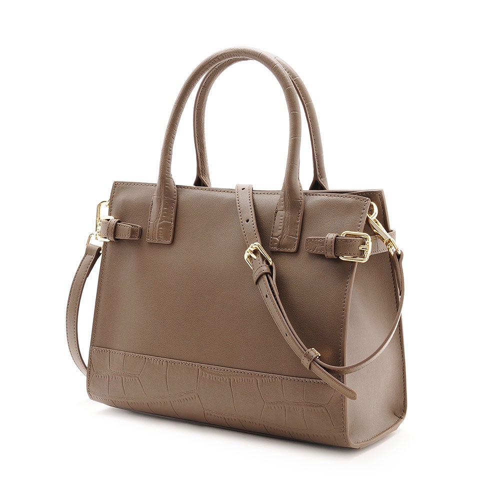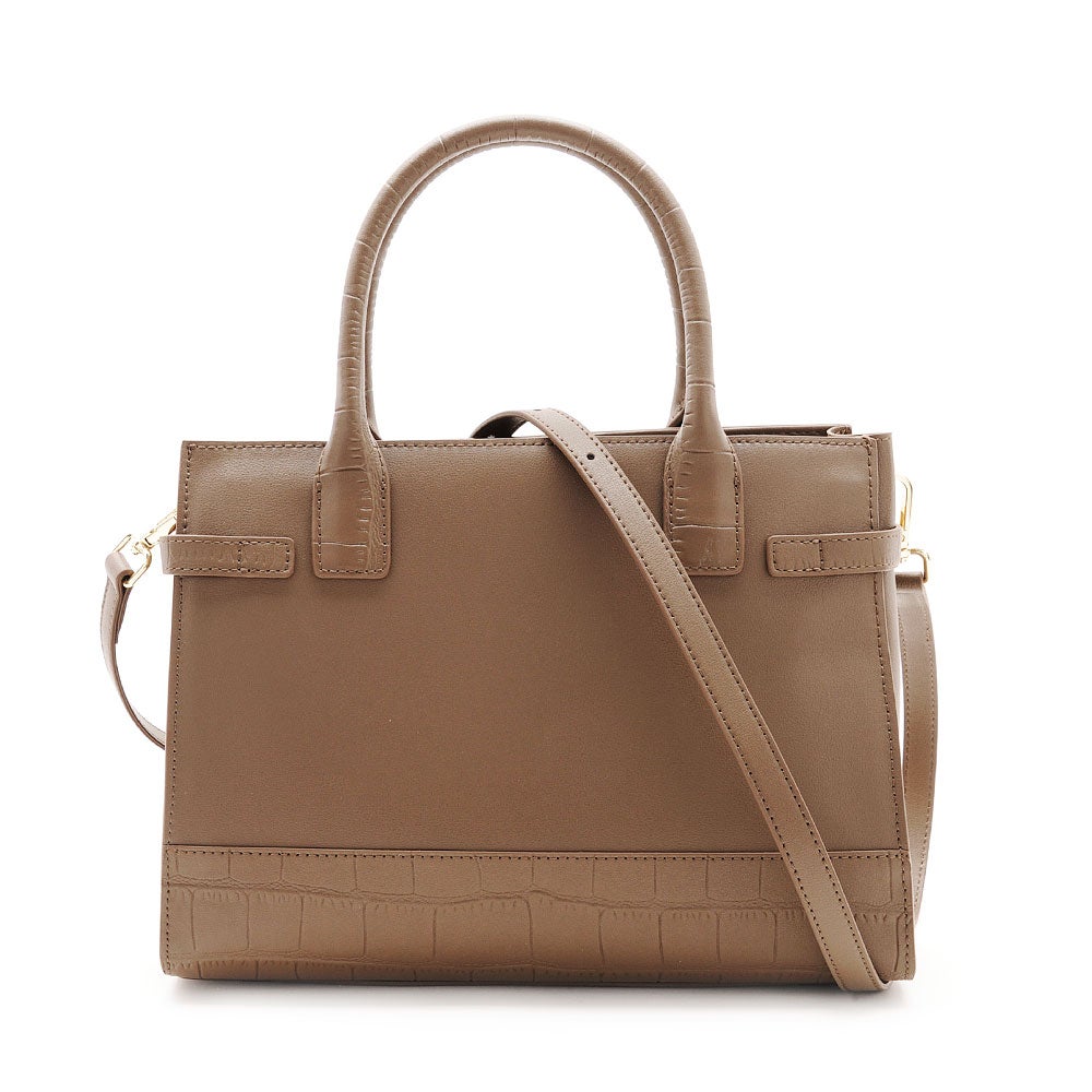 フロントにあしらったベルトディテールと、さりげないクロコ型押しが上品な存在感を放つレザーハンドバッグ。