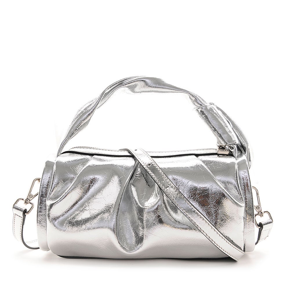 やわらかなドレープが自然な立体感を生み出す、洗練された佇まいのレザーハンドバッグ。