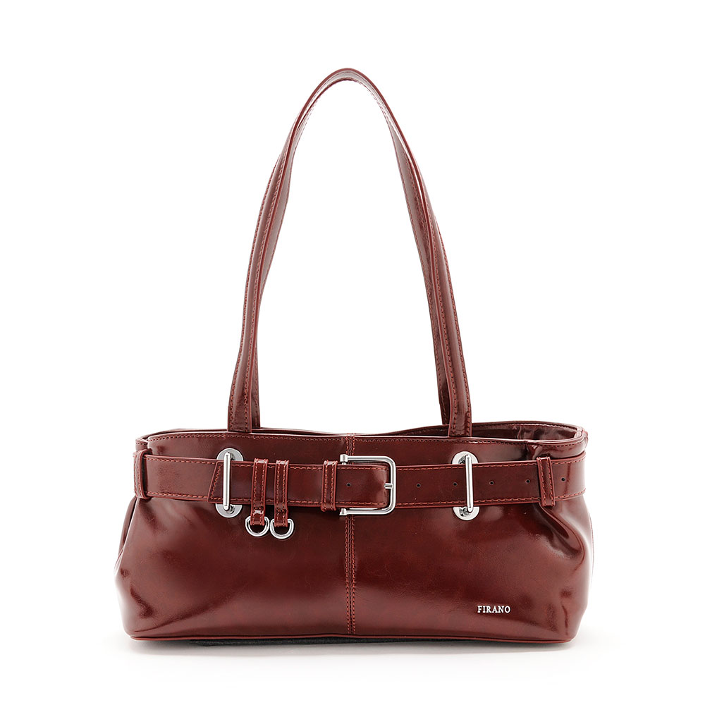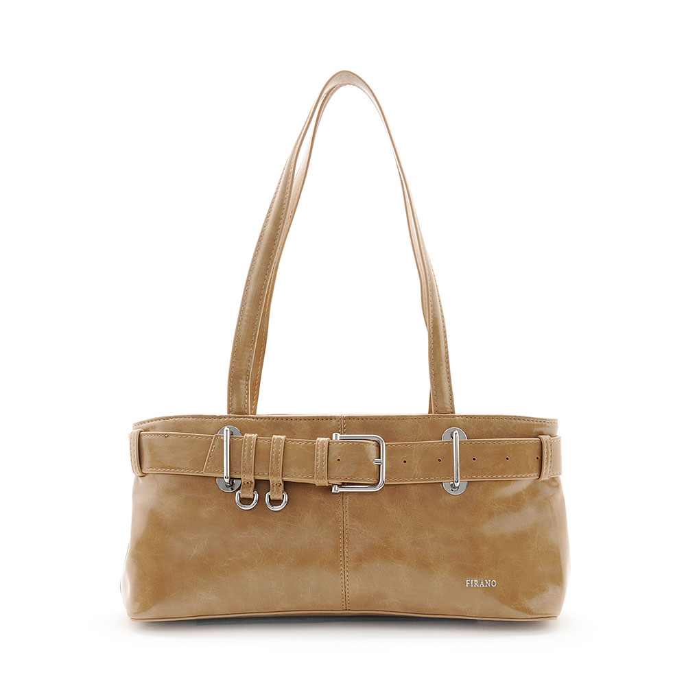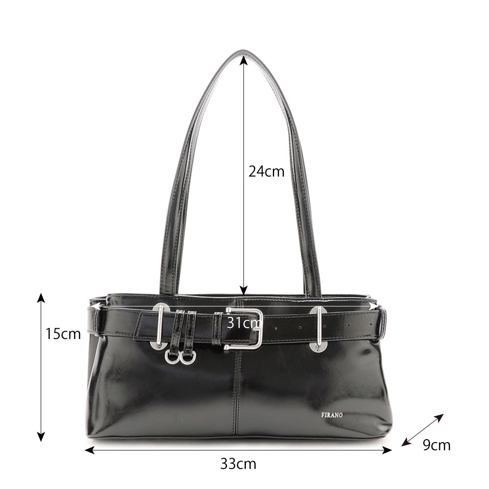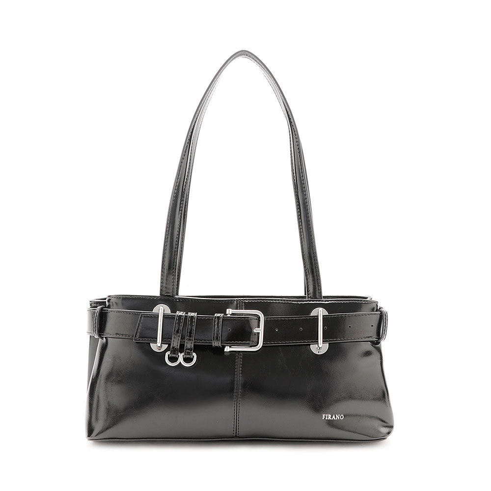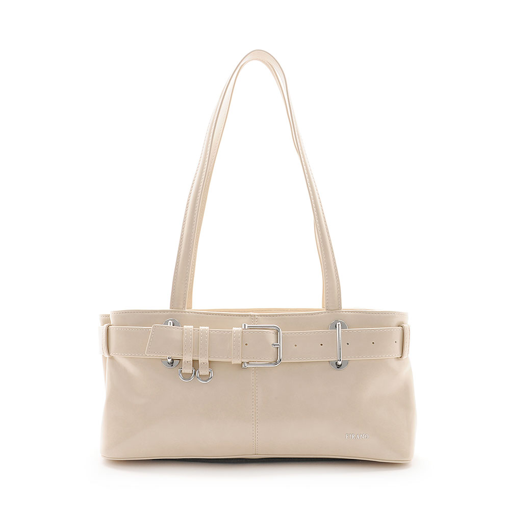 ハリとほどよい光沢感を備えたフェイクレザーが、ミニマルなフォルムに上質な存在感をプラスします。フロントに施したベルトデザインが、シンプルな佇まいに洗練されたアクセントを添えます。