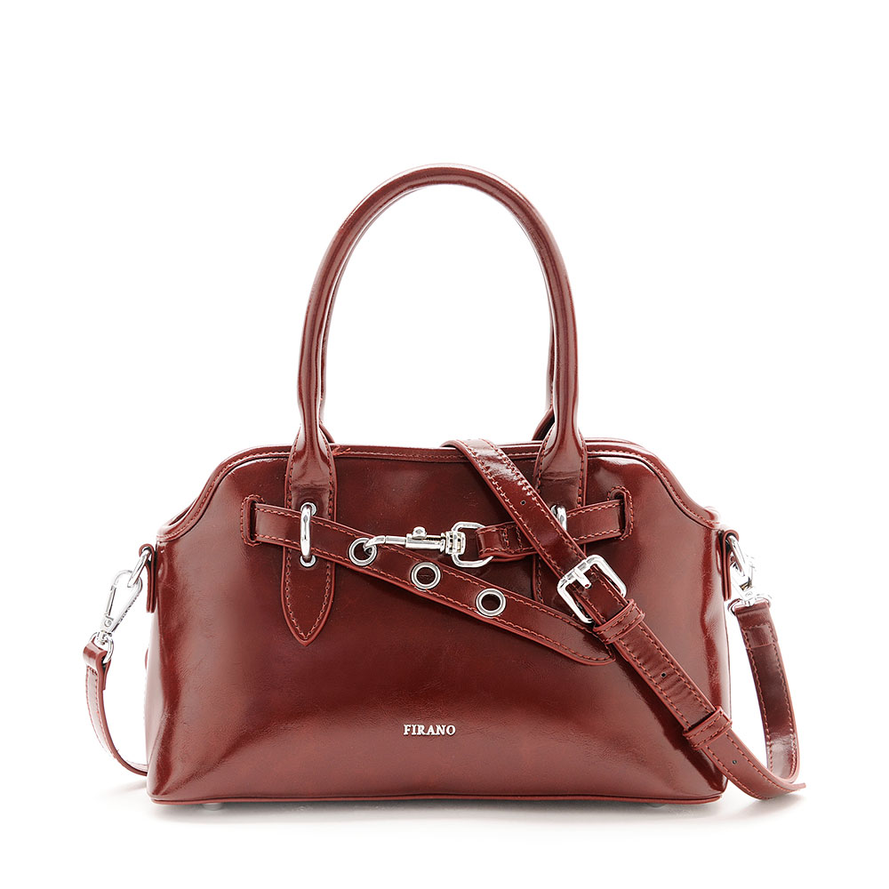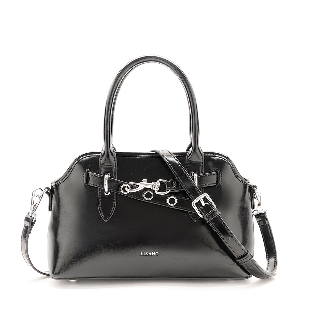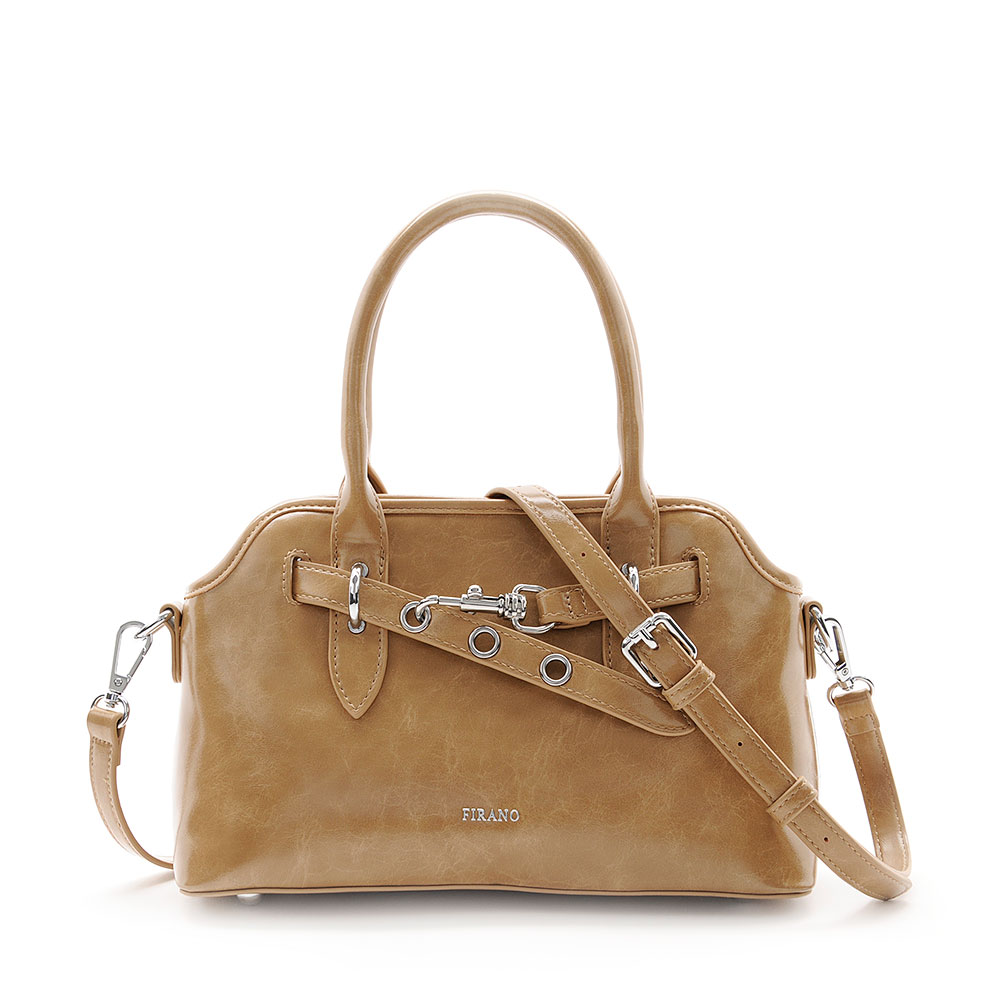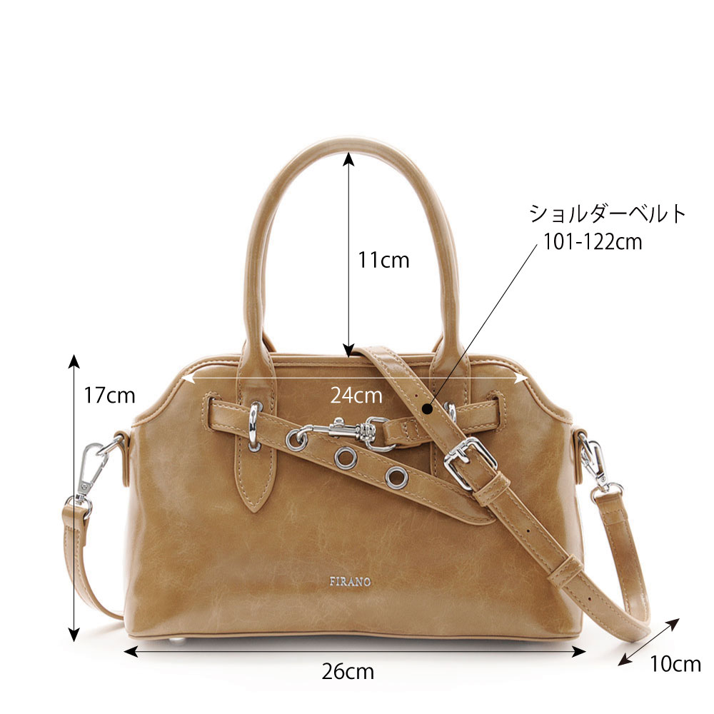 ハリとほどよい光沢感を持つフェイクレザーが、シルエットの柔らかさに上品な印象を添えます。自立するハンドルは持ち姿をすっきり見せ、フロントのベルトデザインがシンプルなデザインにアクセントをプラス。