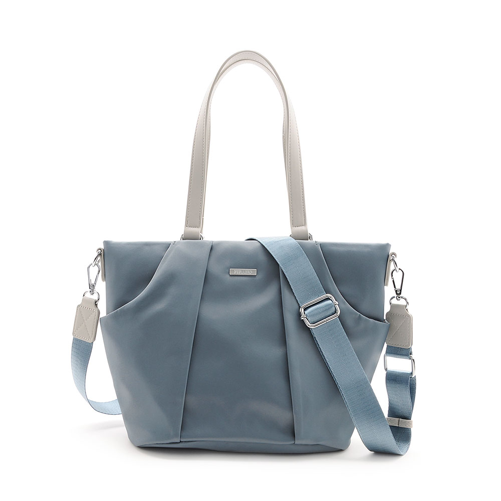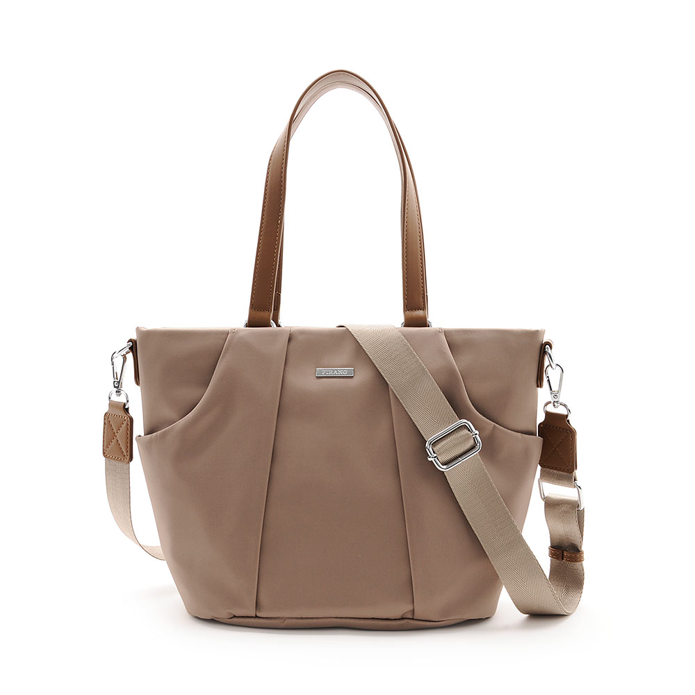 軽やかなナイロン素材にははっ水加工を施し、天候を気にせず使えるのも嬉しいポイント。取り外し可能な幅広ショルダーベルト付きで、肩掛けや斜め掛けなどシーンに合わせた使い分けが可能。