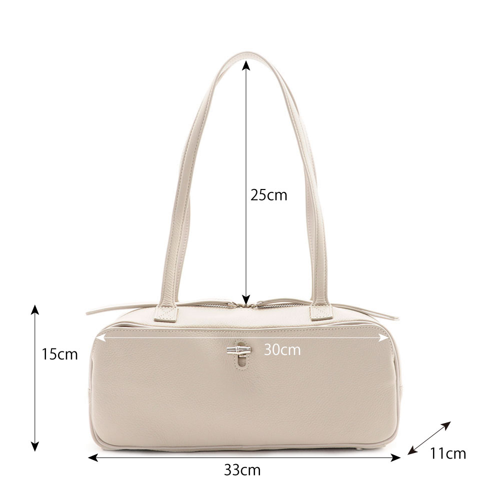 長めのハンドルが肩にもしっかりフィットして、持ち歩きやすいです。本革生地を使用しているため耐久性も良く、安心してご愛用いただけます。