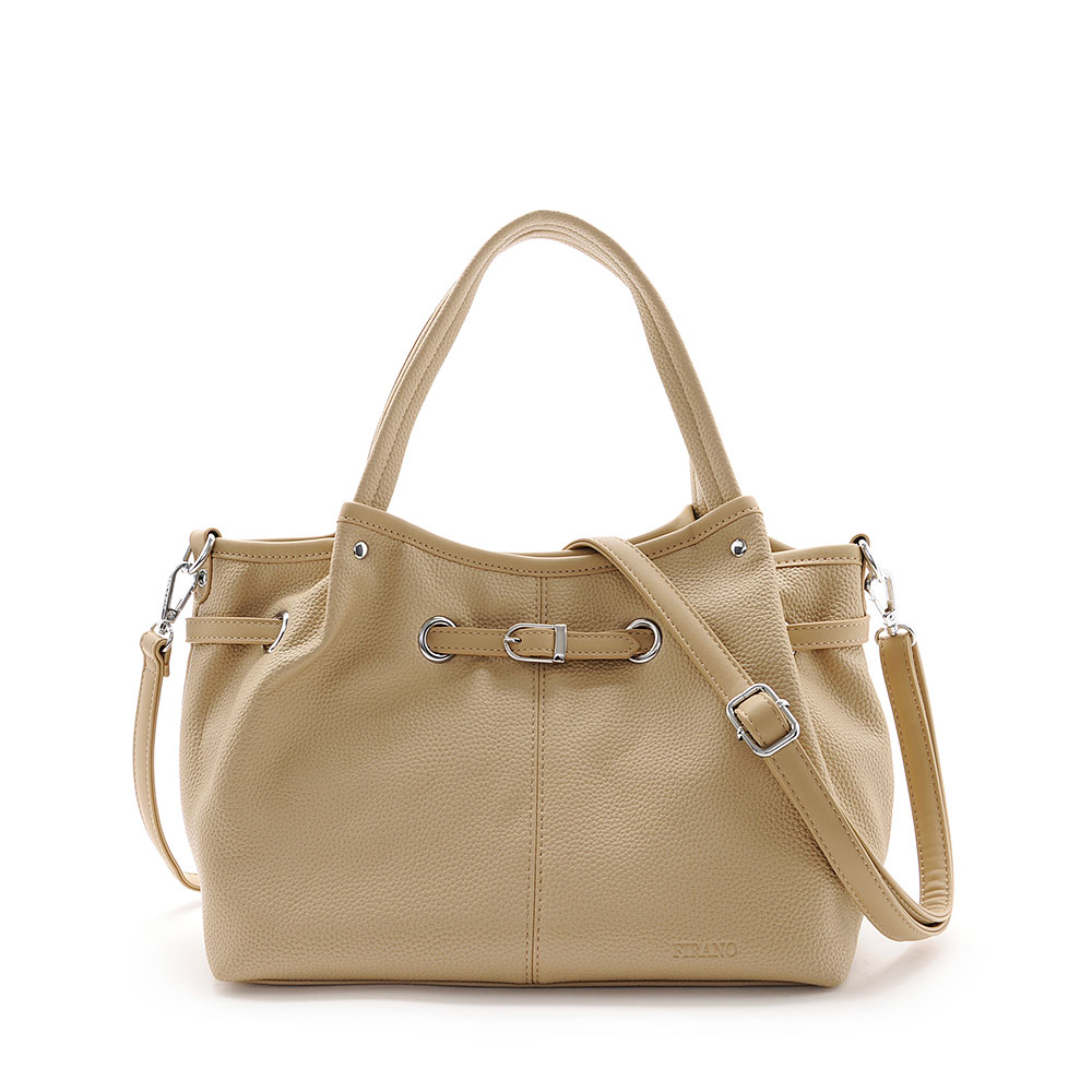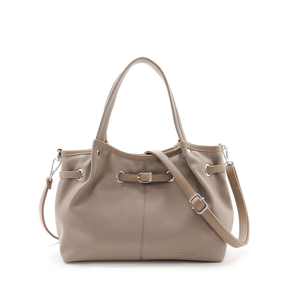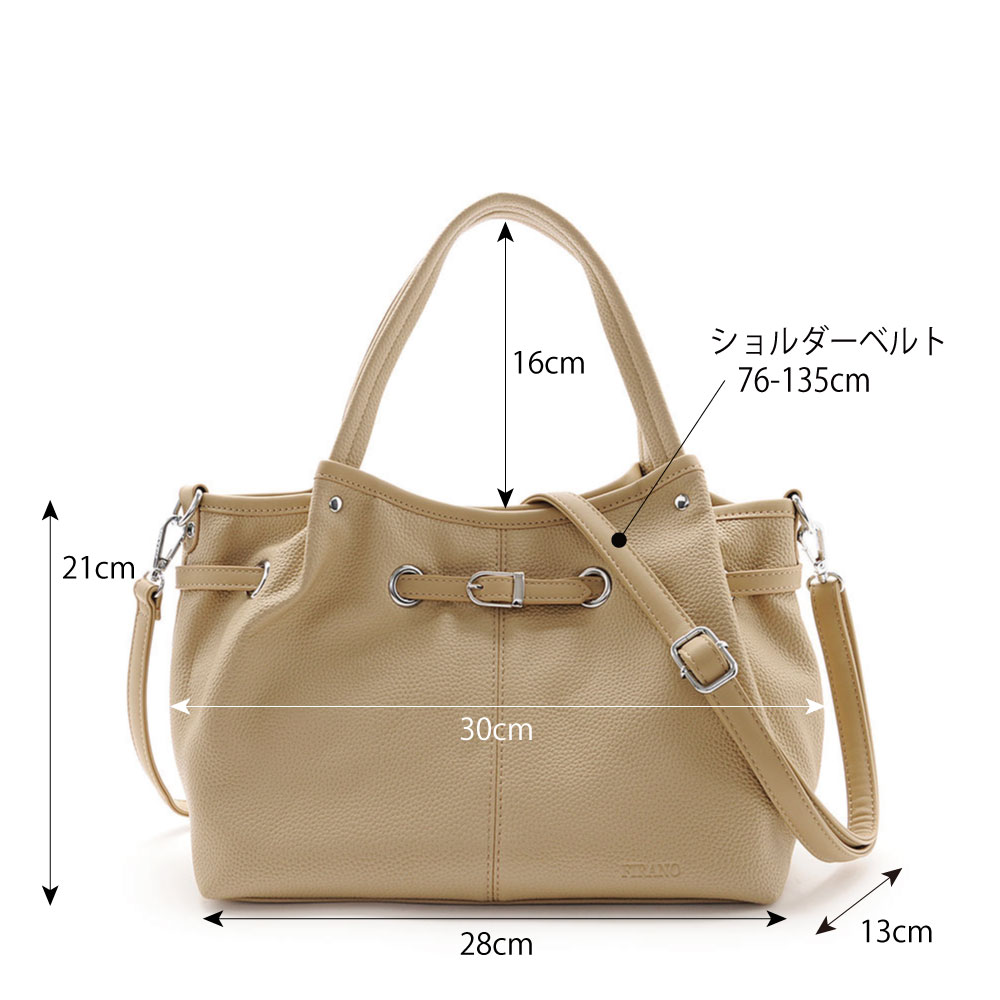 付属のショルダーベルトで肩掛けや斜め掛けにすることもできる2WAY仕様。フェイクレザーのシボ感が高級感溢れるデザイン。