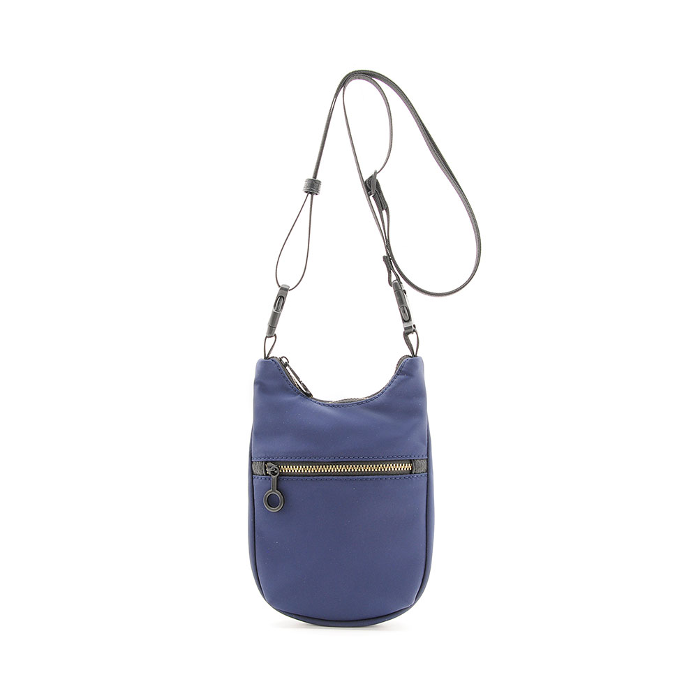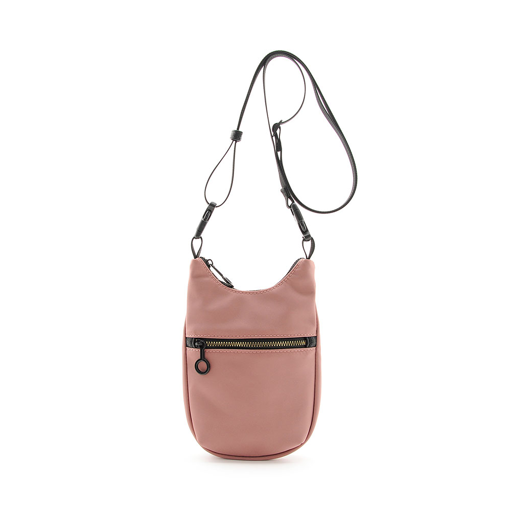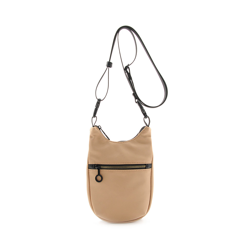 フロントの縦ポケットは、ワイドストラップとゴールドファスナーがデザインのアクセントに。