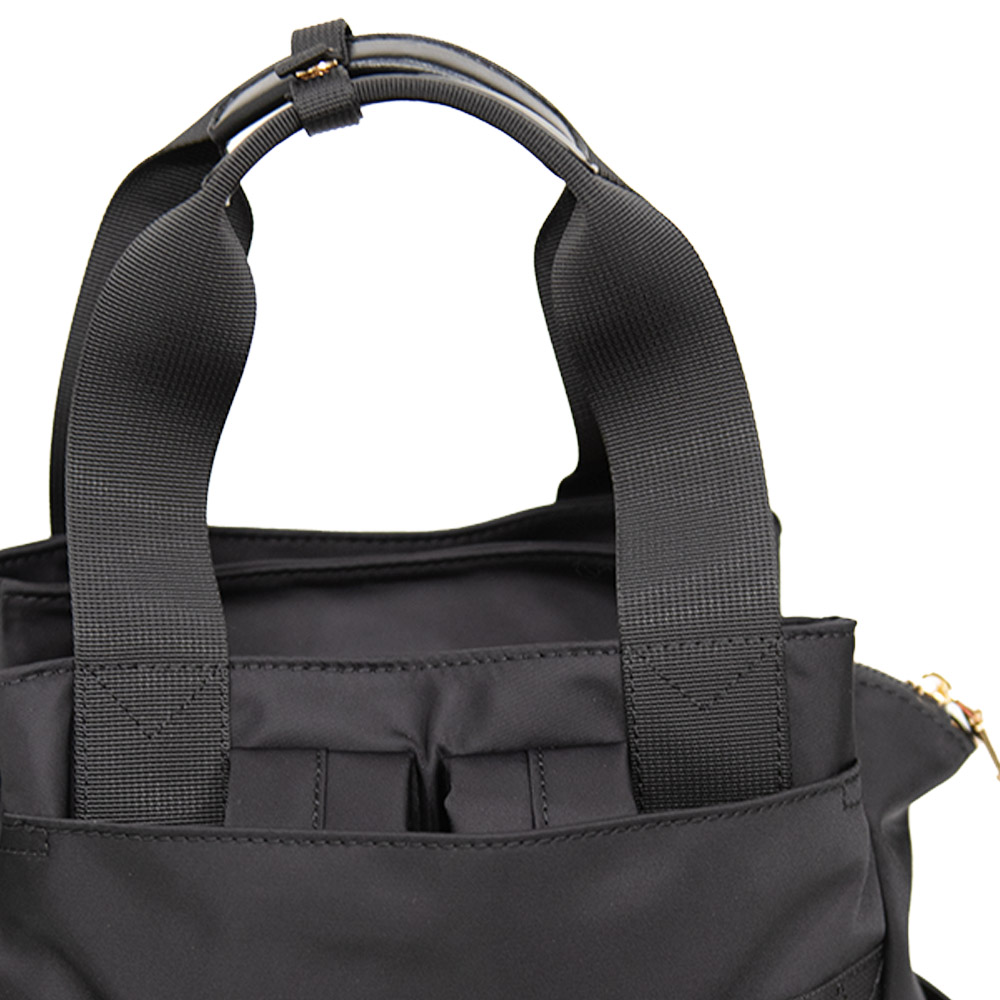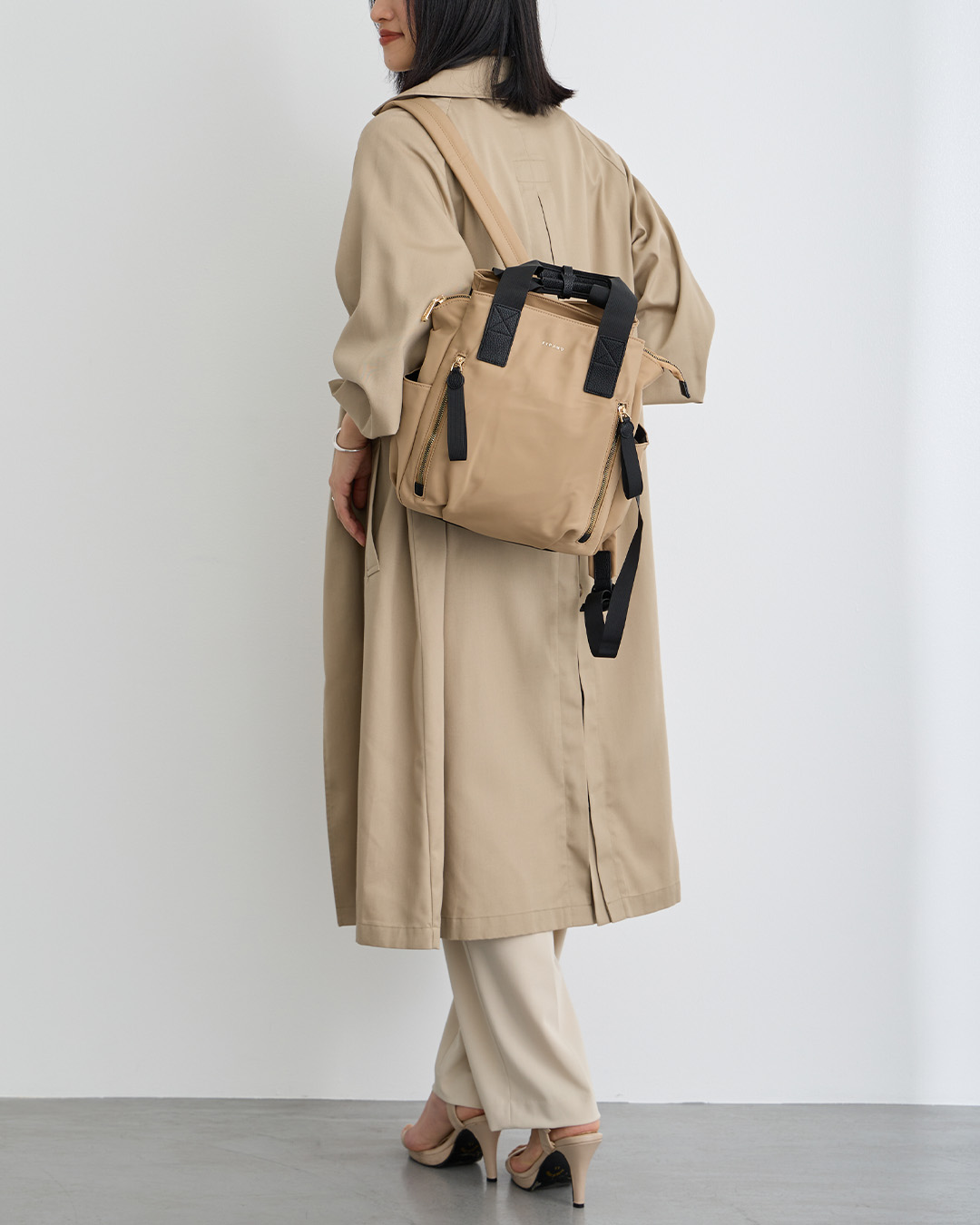 ハンドルはスナップボタンでまとめることができ、ショルダーベルトはバックポケットに収納が可能なストレスフリーに使えるこだわりの2WAY仕様。