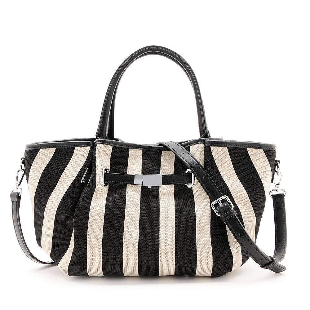 存在感のあるストライプ柄が目を惹く、印象的なデザインバッグ。