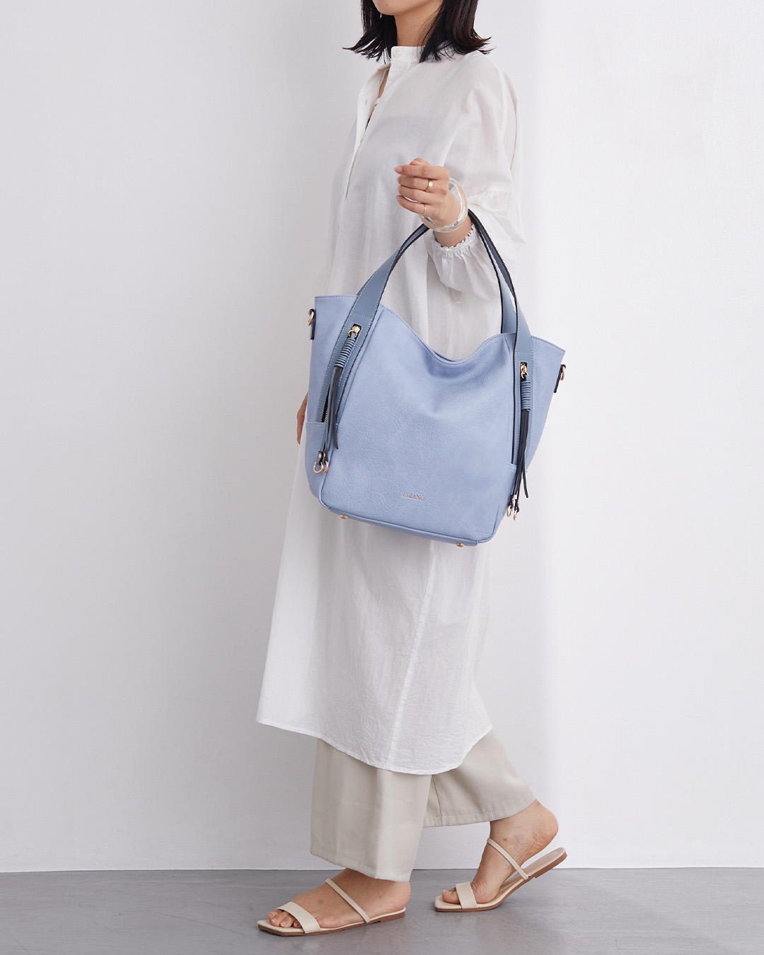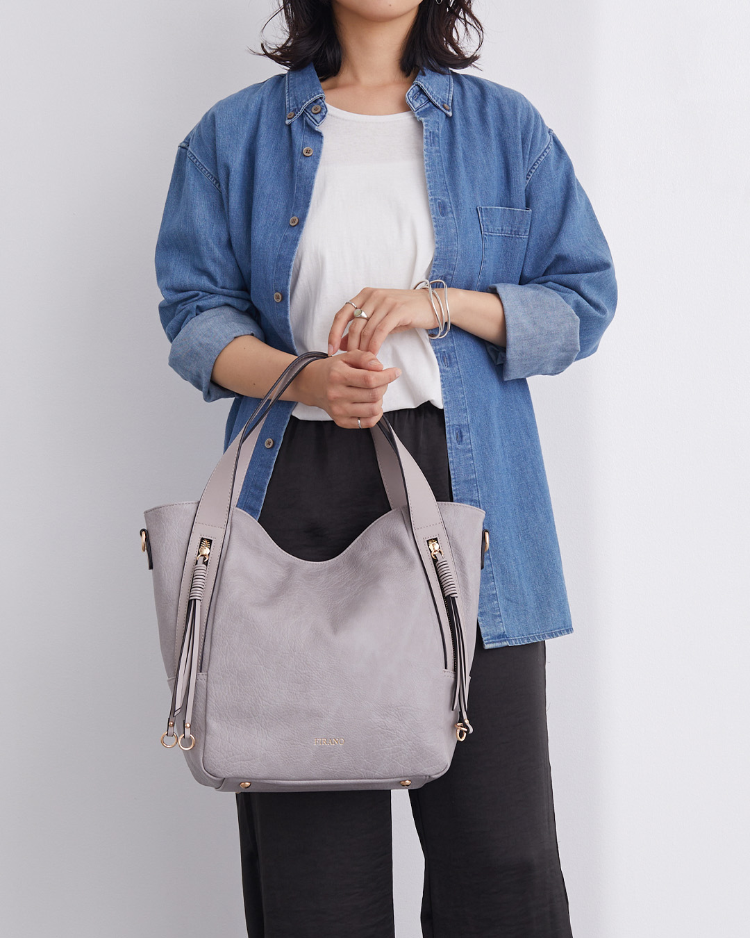 付属のショルダーベルトを使えば、肩掛けや斜め掛けも可能。両手を開けたいときや長時間のお出かけにも快適に持ち運べます。シンプルながらもエレガントなファスナーデザインが、大人の洗練された印象を演出。
