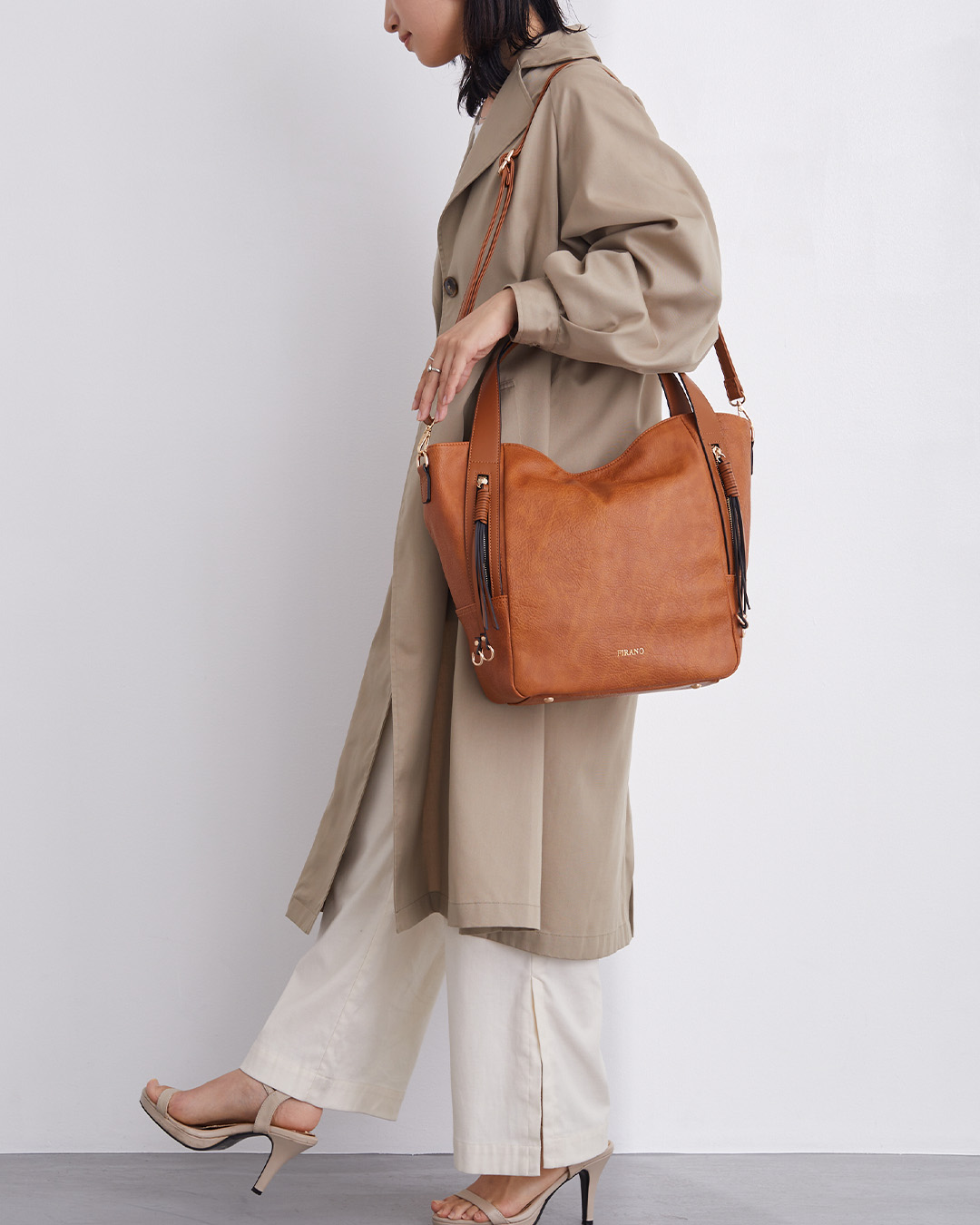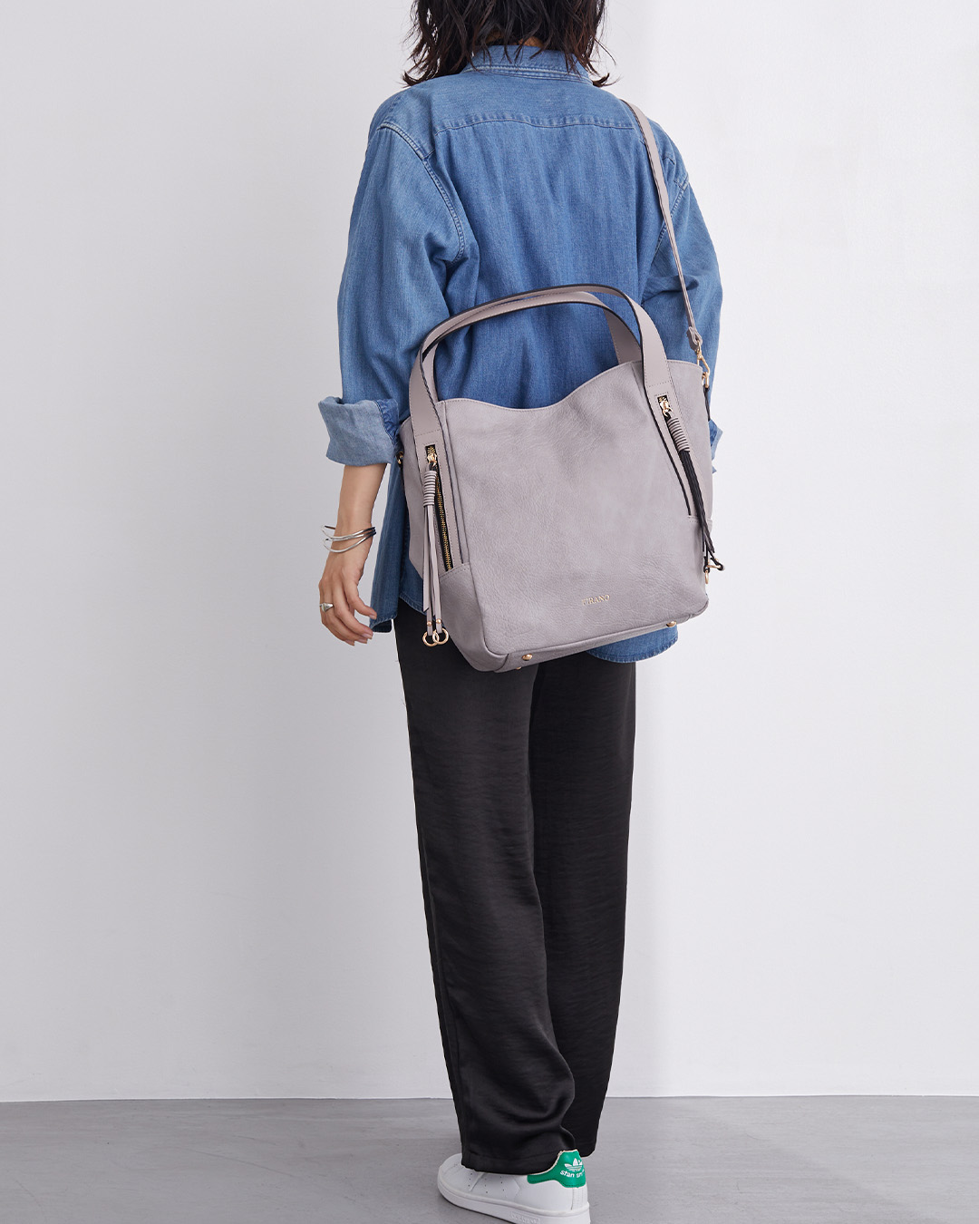 取り外し可能なショルダーベルトで斜め掛けにスタイルチェンジもできます。ストリングチャームを使用したファスナーデザインでシンプルながらもスタイリッシュな雰囲気に。