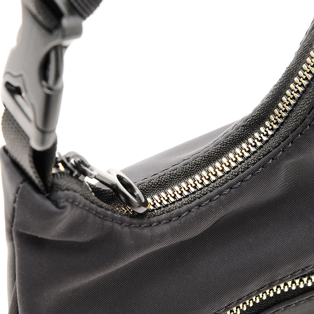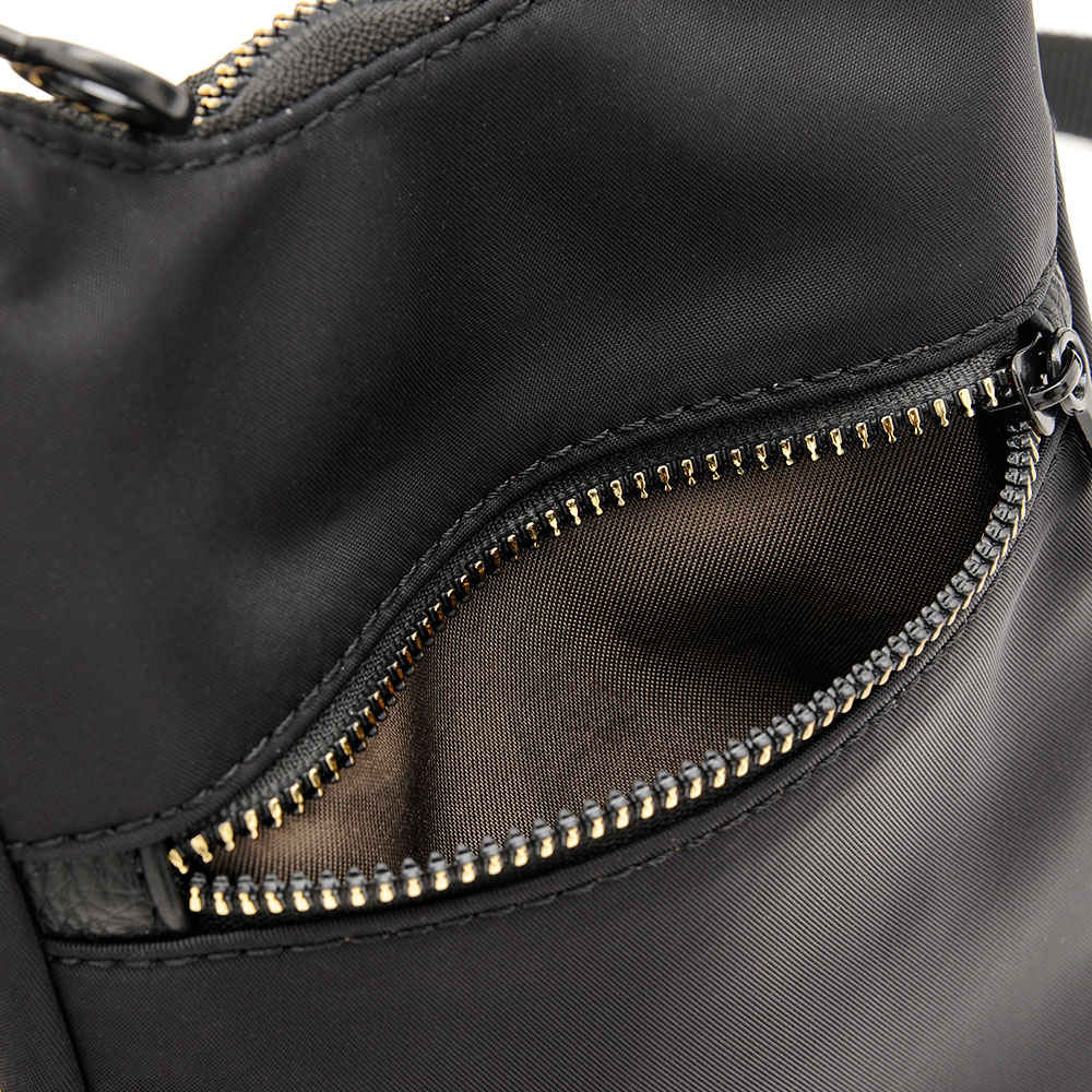 フロントにはファスナーポケットを備え、小物を分けて収納できて便利です。