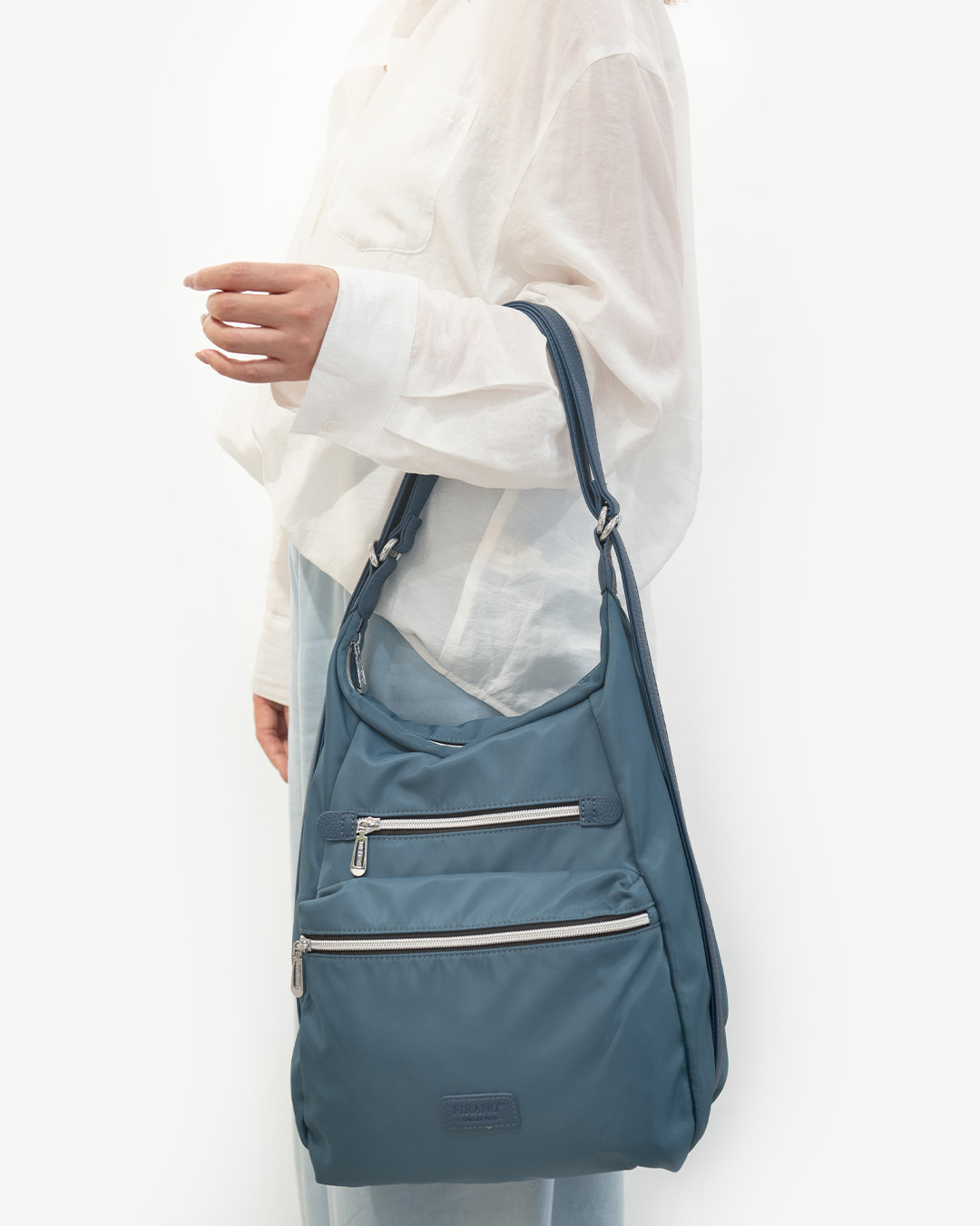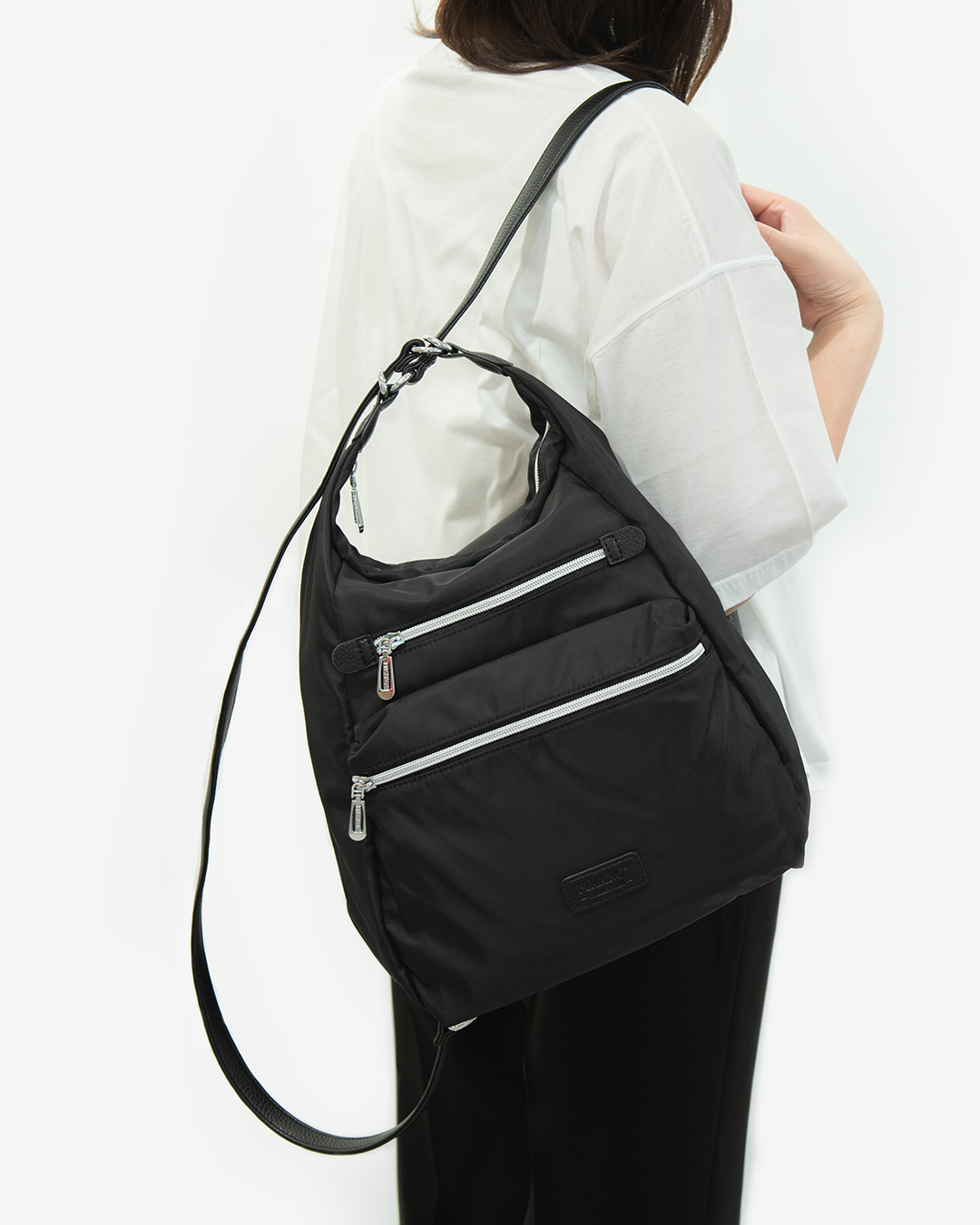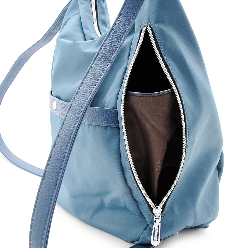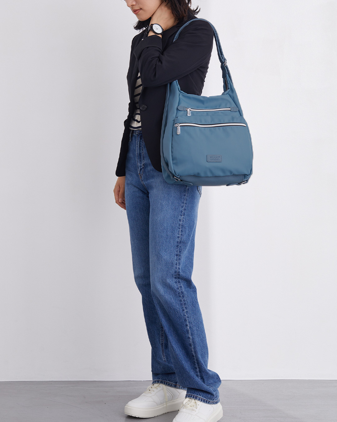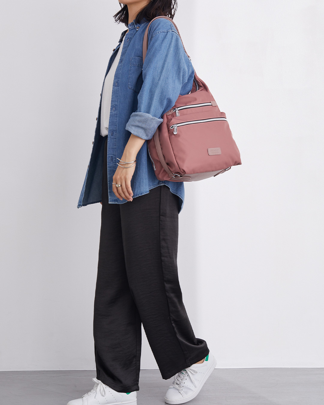 ほんのり光沢感のあるナイロン素材にははっ水加工が施され、雨の日やアウトドアでも安心して使える機能性を備えています。