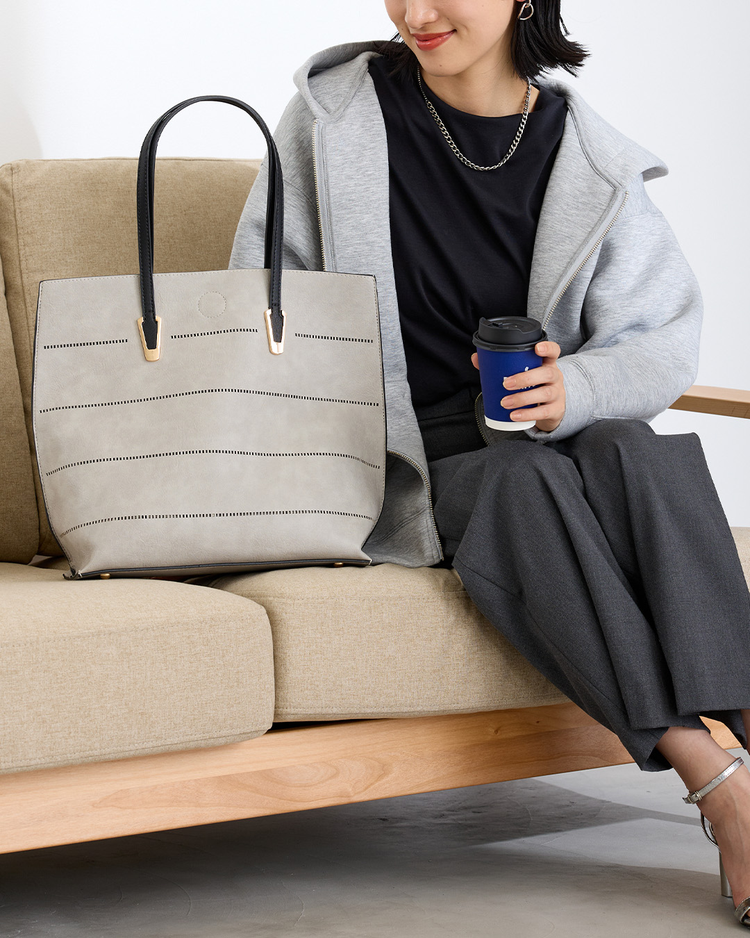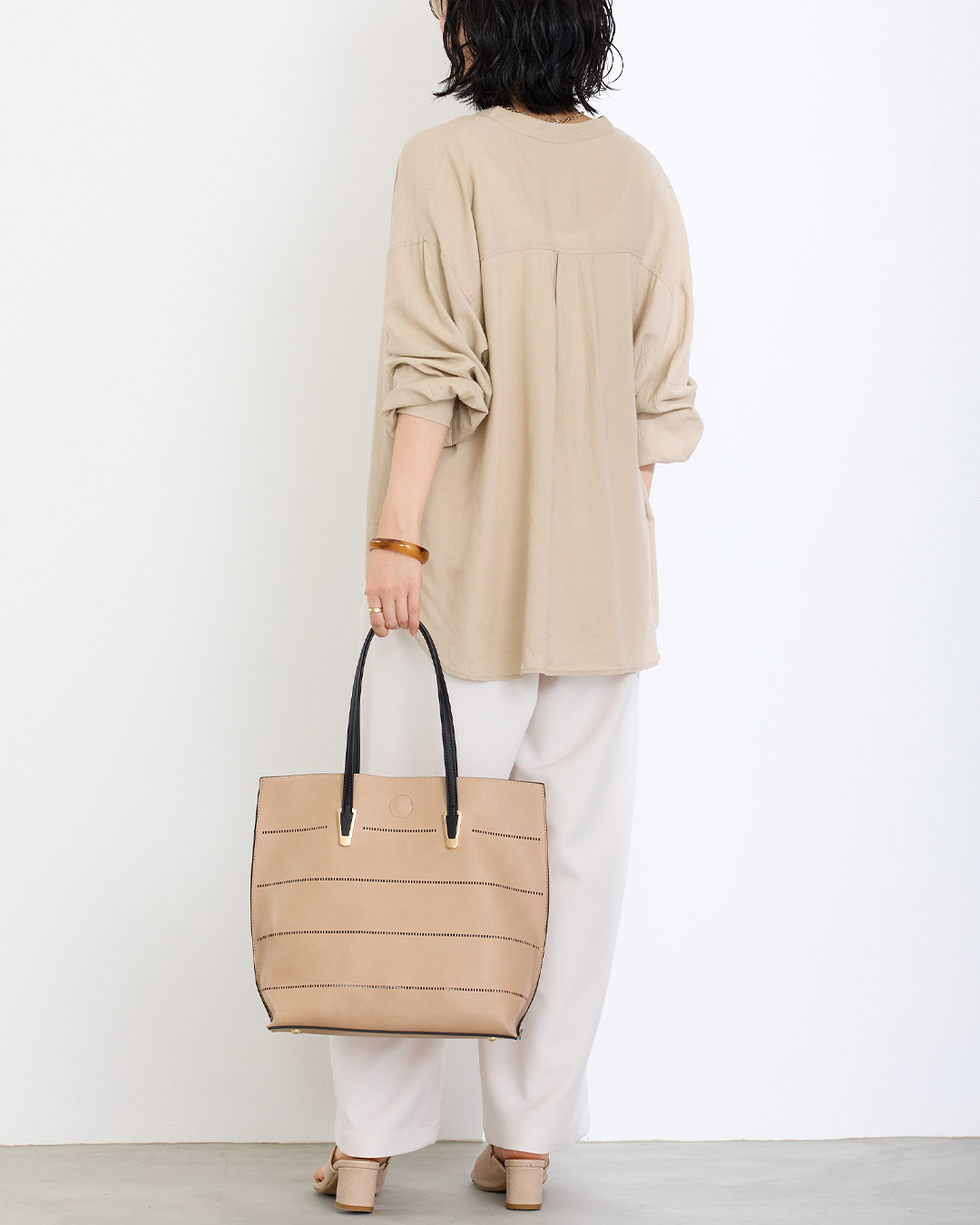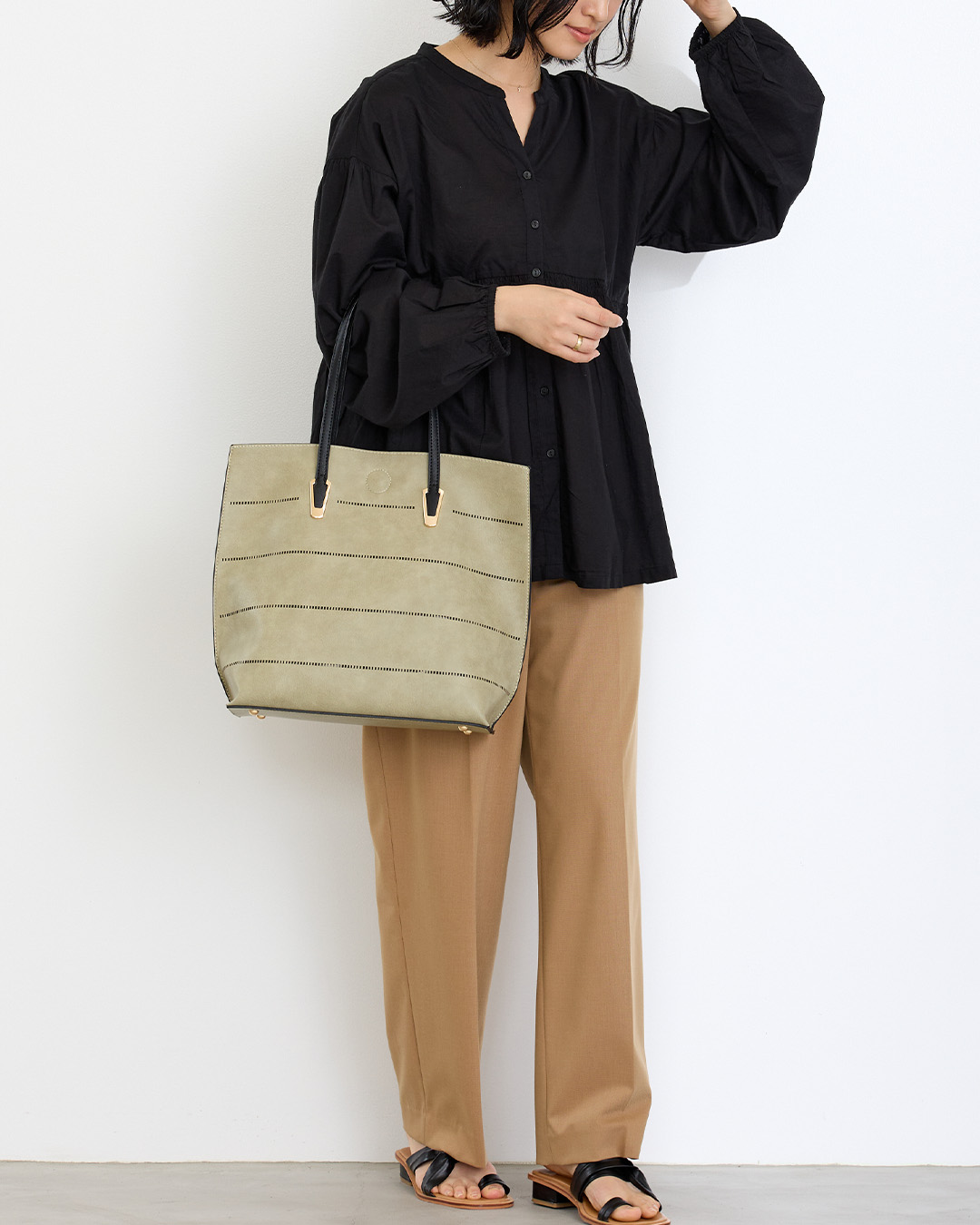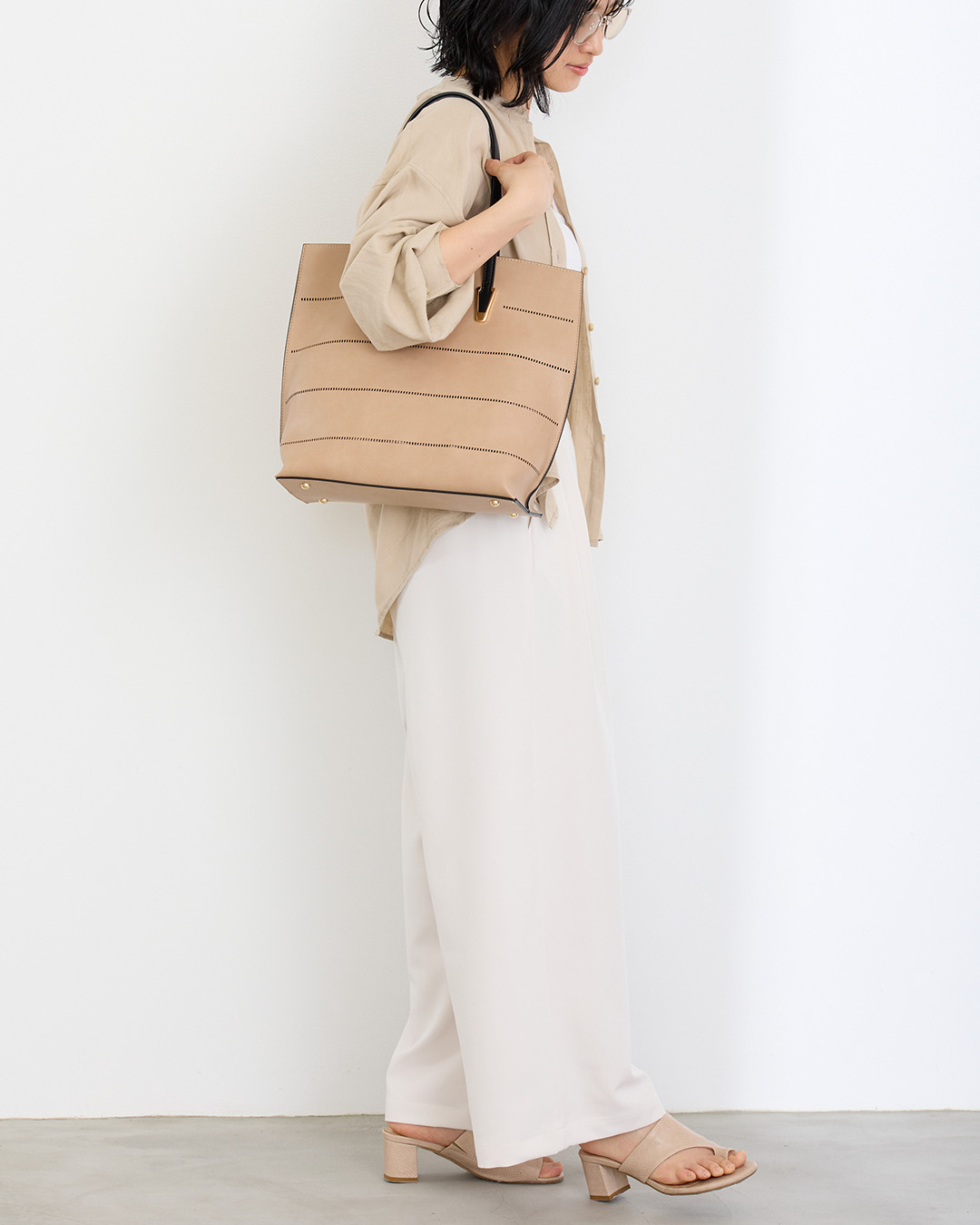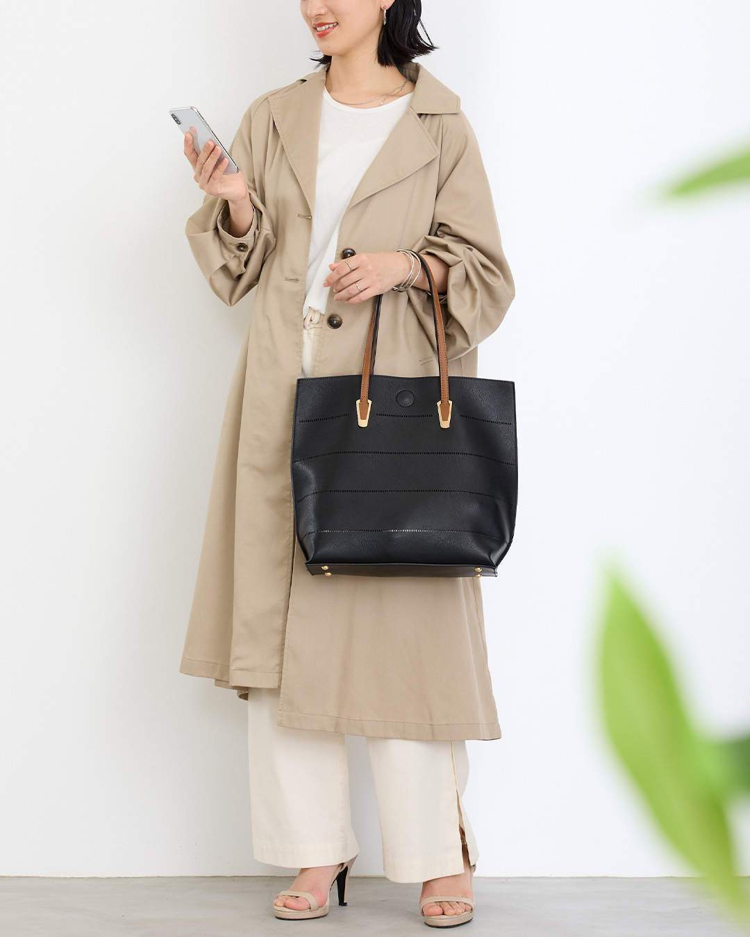 たっぷり大容量サイズで荷物の多いビジネスやトラベルシーンでも大活躍。上品なシルエットながらも、底マチや奥行きもしっかりとあるため、荷物の収納もしやすいです。