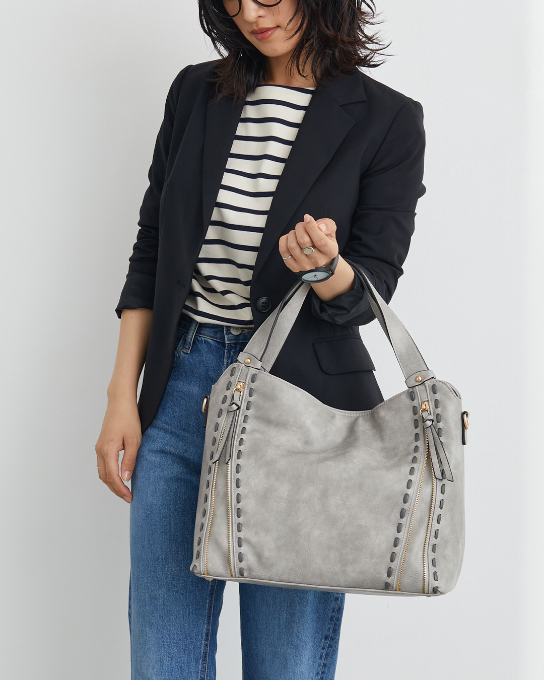 コメント サイドのゴールドファスナーとワイドなステッチで高級感をプラスしたデザイントートバッグ。