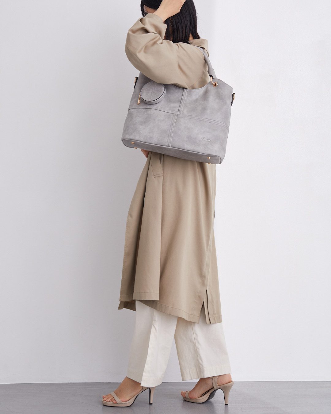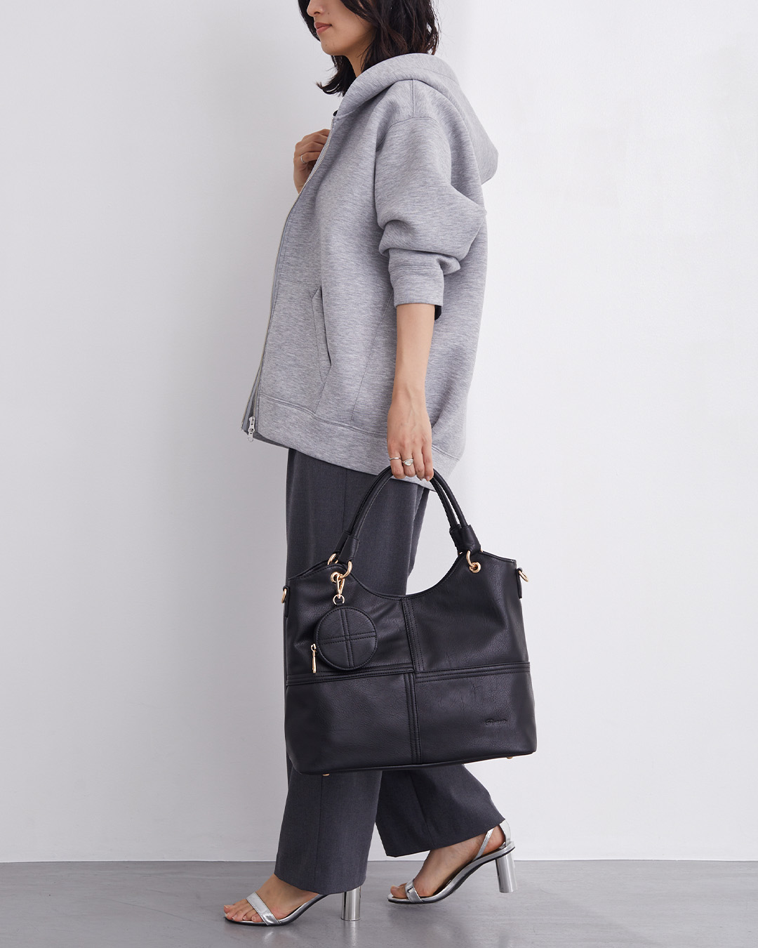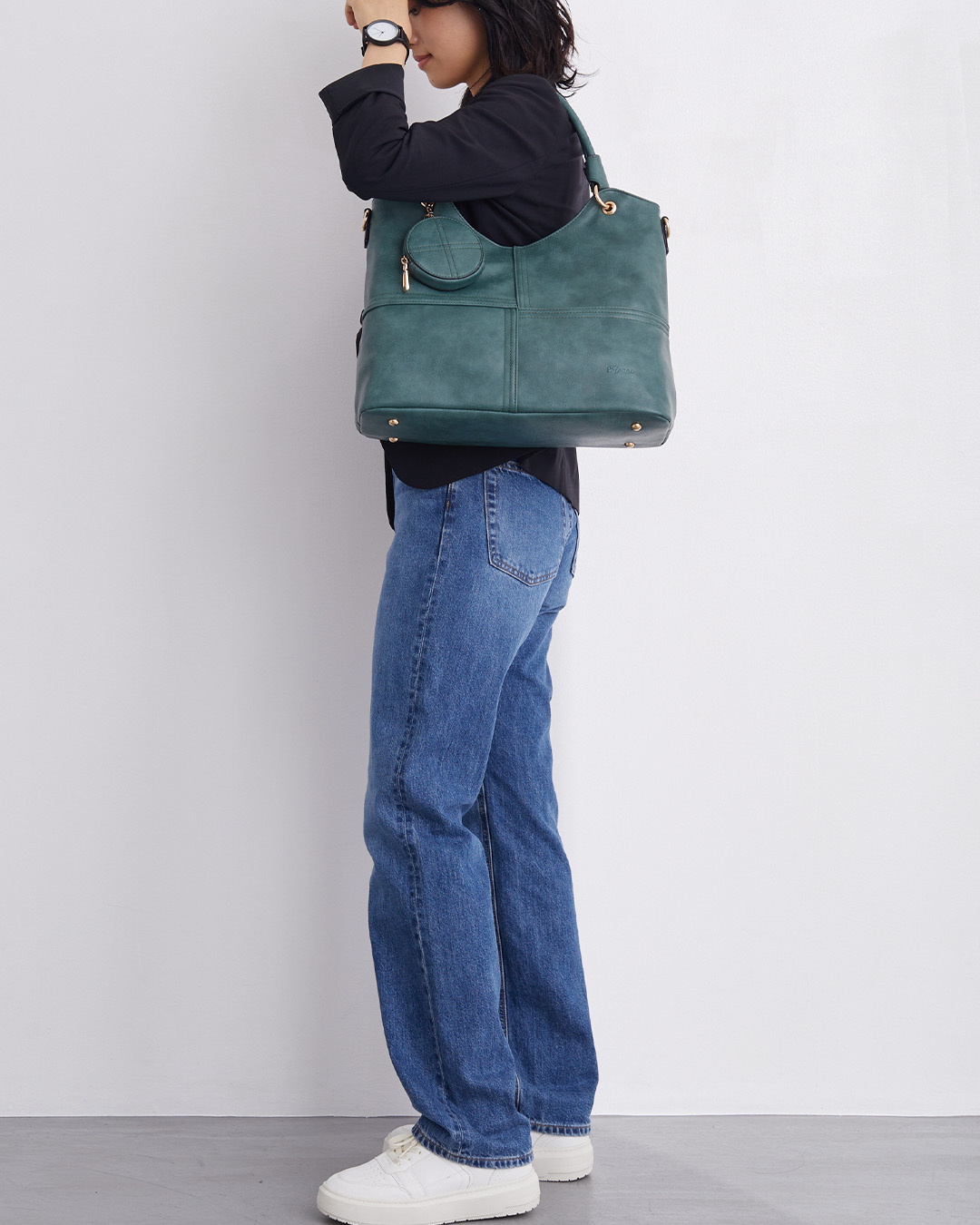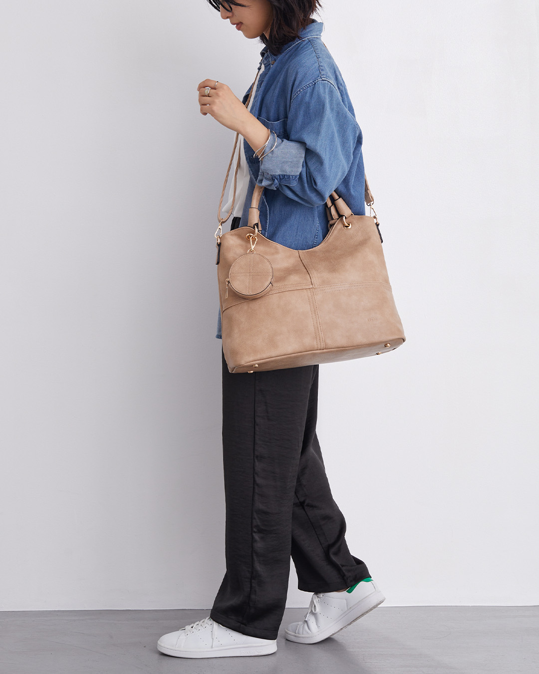 丸い金具のハンドルを使用しているので、持ちやすく、荷物を取り出す際もサッと倒れて便利です。セットのポーチがアクセントになり、取り外しができるため気分に合わせてチェンジ。付属のショルダーベルトで斜め掛けもできます。