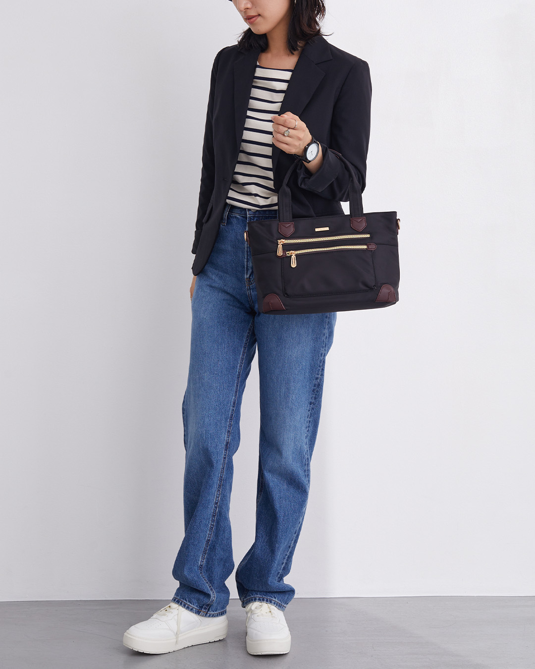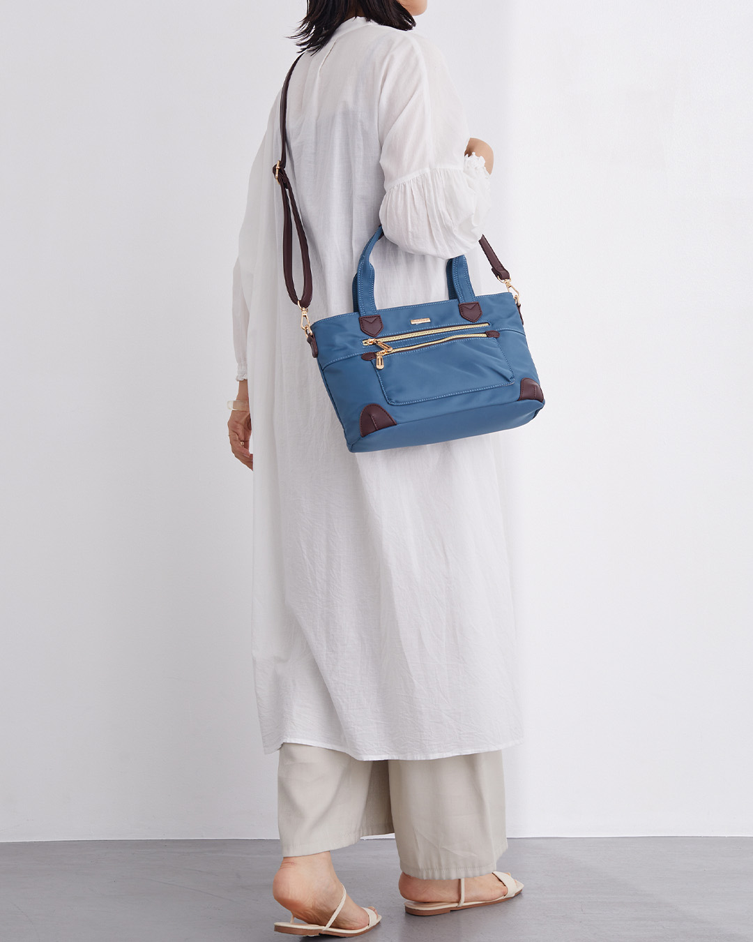 前後には便利なファスナーポケットを3つ配置。さらに内側にもポケットが3つあり、スマートフォンや財布、折り畳み傘など、細かいアイテムも整理しながら収納可能です。
