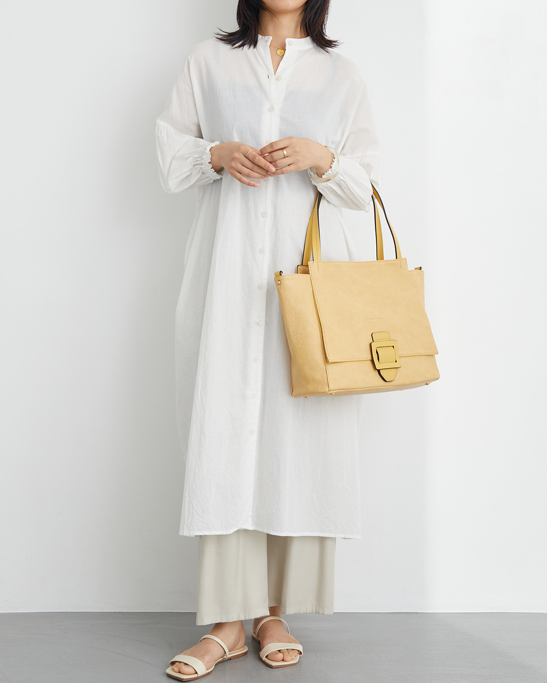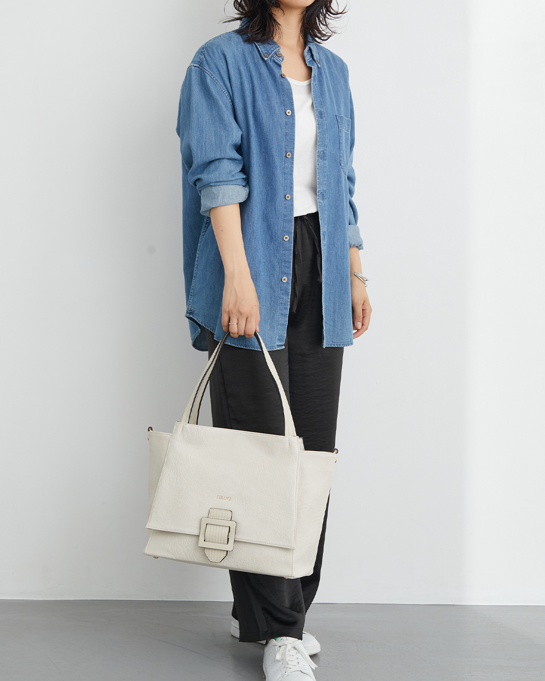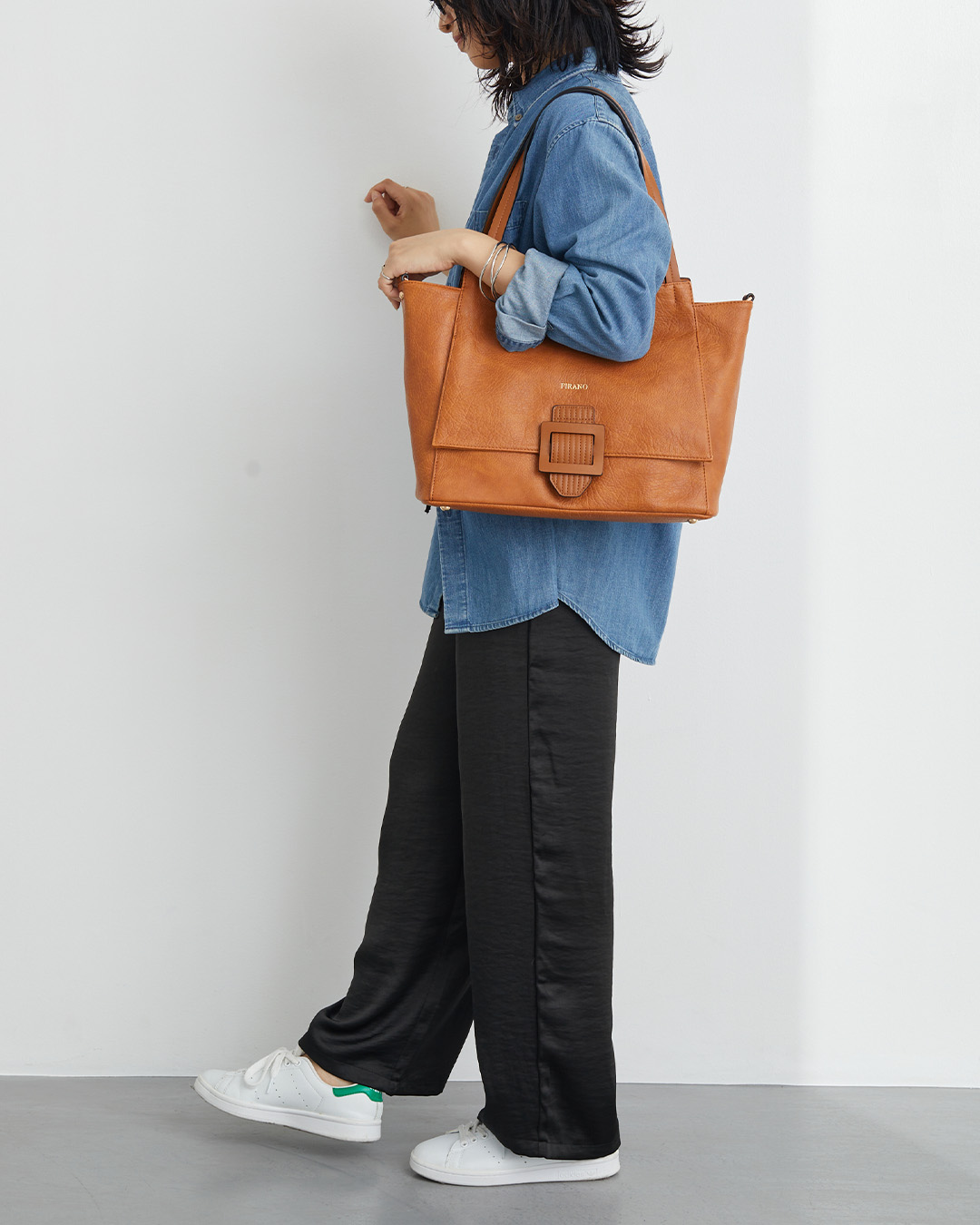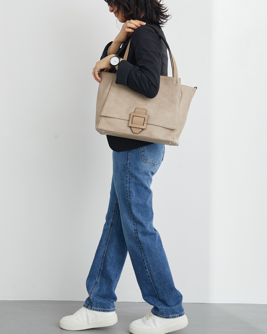柔らかく体に馴染む高品質な素材感。目を惹く大きめなバックルデザインがシンプルなトートを華やかに彩ります。